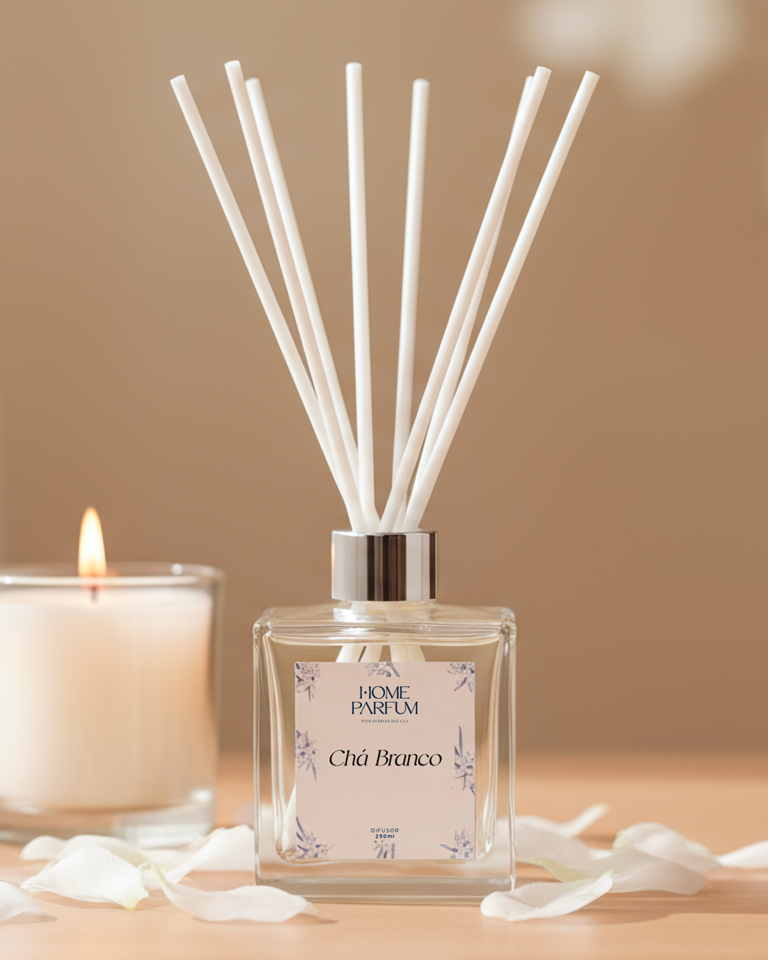 O Chá Branco é uma fragrância clássica e sofisticada, ideal para ambientes de descanso, que traz leveza e calma com suas notas cítricas e florais.